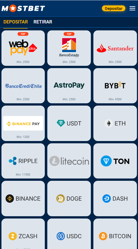 Los jugadores de Chile pueden depositar fondos y retirar sus ganancias en Mostbet de forma rápida y cómoda gracias a la compatibilidad con métodos de pago locales y modernos. La plataforma admite sistemas bancarios chilenos como WebPay, BancoEstado y Santander, además de billeteras electrónicas, AstroPay y criptomonedas populares como USDT, Bitcoin, Ethereum y Binance Pay. Esta variedad permite a cada usuario elegir el método más conveniente según sus preferencias. Todas las transacciones se procesan de manera segura, sin comisiones ocultas por parte de Mostbet y con tiempos de acreditación optimizados.