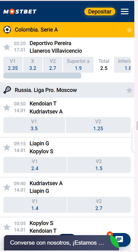 Mostbet ofrece a los jugadores de Colombia una amplia línea de apuestas, tanto previas al partido como en tiempo real. Encontrarás decenas de disciplinas deportivas, incluidas las más seguidas en el país: fútbol, tenis, baloncesto y béisbol. Las cuotas son competitivas – en eventos populares pueden alcanzar 2,5–3,0, especialmente en combinadas. Se aceptan apuestas simples, múltiples, sistemas y combinadas, además de una útil función de venta anticipada.