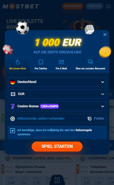 Die Registrierung bei Mostbet ist für Spieler aus Deutschland schnell und unkompliziert. Der Buchmacher bietet mehrere Anmeldeoptionen, sodass Nutzer die Methode wählen können, die am besten zu ihren Bedürfnissen passt. Der gesamte Prozess dauert in der Regel nur wenige Minuten.
