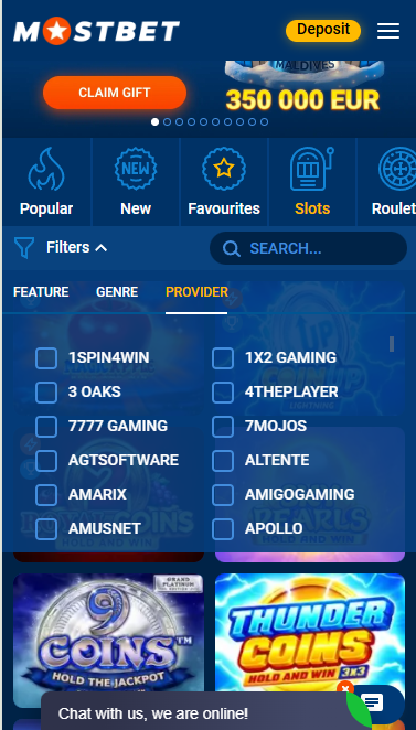Mostbet කැසිනෝ කැටලොග් එකට 250කට වඩා වැඩි ප්රොවයිඩර්වරුන්ගෙන් ලබා දෙන ක්රීඩා 7000කට වඩා ඇතුළත් වේ. ප්රධාන කොටස ස්ලොට් වන අතර, ටේබල් ක්රීඩා සහ Live කැසිනෝ ද ලබා ගත හැක.