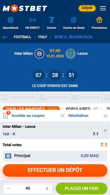 Mostbet est une société internationale de paris sportifs qui opère activement sur le marché marocain, en proposant aux joueurs locaux des paris sportifs ainsi qu’un casino en ligne complet avec des bonus en monnaie nationale (MAD). La plateforme est adaptée aux utilisateurs marocains : elle prend en charge les méthodes de paiement locales, les portefeuilles mobiles, les virements bancaires et les cryptomonnaies.