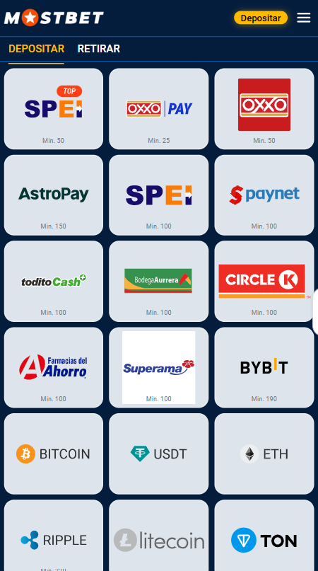 Mostbet México ofrece a sus jugadores una amplia variedad de métodos para recargar su cuenta en pesos mexicanos. Puedes usar transferencias bancarias por SPEI, depósitos en efectivo en tiendas como OXXO o Farmacias del Ahorro, así como métodos modernos como AstroPay o criptomonedas. Todas las transacciones son seguras y el saldo se acredita al instante o en menos de una hora. El depósito mínimo es de solo 25 MXN, lo que hace que la plataforma sea accesible para cualquier usuario en el país.