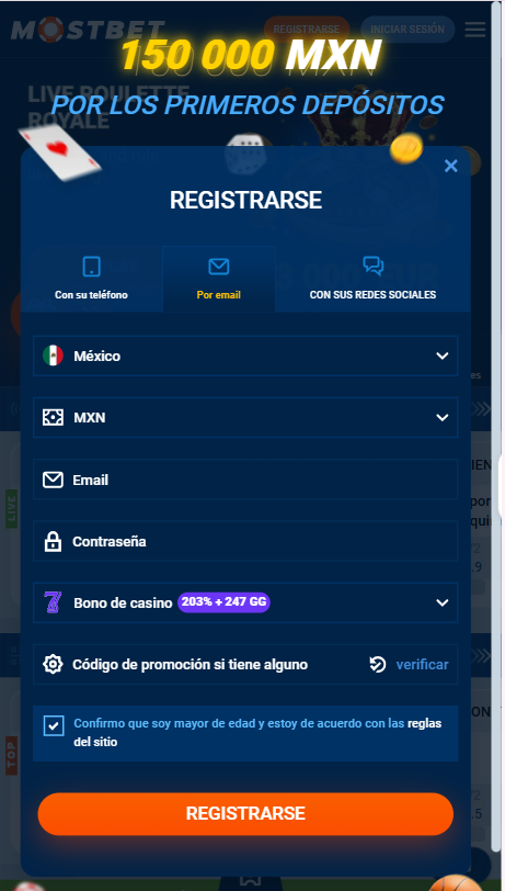 Mostbet da la bienvenida a los jugadores de México con acceso a más de 7000 juegos, más de 40 disciplinas deportivas, transmisiones en vivo y generosas bonificaciones. Registrarse es muy fácil y rápido: puedes hacerlo con tu número de teléfono, correo electrónico o redes sociales. Cualquiera de las tres opciones te tomará menos de dos minutos. Al completar el registro, recibirás un paquete de bienvenida de hasta 150 000 MXN + 600 giros gratis en el juego Sweetie Fox, disponible desde tu primer depósito.
